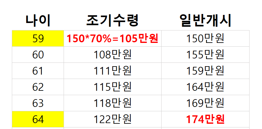 아래에서 나이별 조기수령 금액을 확인해 보실 수 있습니다.